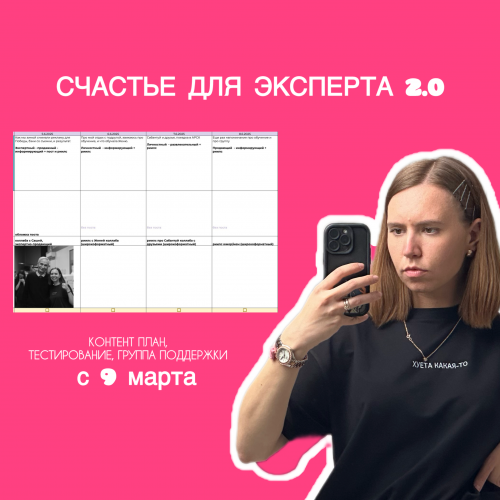 Счастье для эксперта — это двухнедельный интенсив для тех, кто не может выйти в сторис или опубликовать пост. Для кого риилсы это что-то ужасное и танцы под музыку. Это контент план с идеями на каждый день, благодаря которому вы сможете проверить, какой контент работает в вашем случае. Это пинок под зад от меня для тех, кто выходит в сторис так "Привет меня давно тут не было" и пропадают на неделю. Это не волшебная таблетка, это не залетные риилс, это то с чего стоит начать, чтобы показать себя и свое творчество миру.