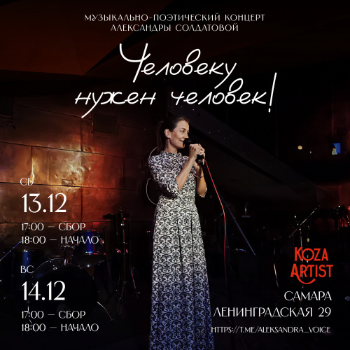 А в 18:00 начнется незабываемый, теплый вечер с Александрой, окутывающий красотой звуков, смыслов и слов. Вечер, который вы запомните надолго и захотите вернуться вновь!