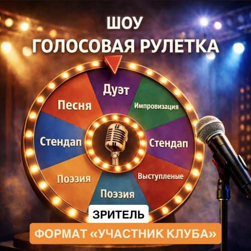 Шоу «Голосовая рулетка» - это сцена без подготовки. Формат выступления выбирает рулетка, зрители голосуют, лучшие участники получают призы. Можно петь, говорить, импровизировать или читать  - тебе можно выйти и попробовать.