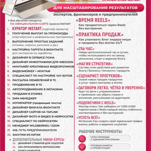 Полная поддержка: рабочие чаты, пошаговые инструкции, готовые материалы, шаблоны и скрипты для общения — никаких догадок, только конкретные действия.